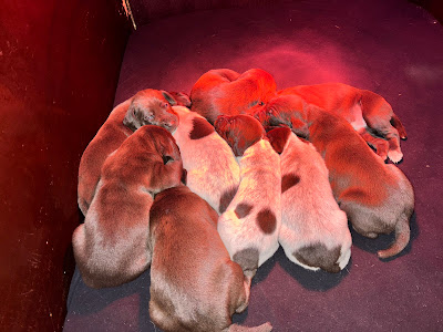 Dann zurück zu Mama und zur Wärmelampe. Und obwohl es nur eine kurze Zeit außerhalb der Kinderstube war, suchen sie sofort die Wärme unter der Wärmelampe.